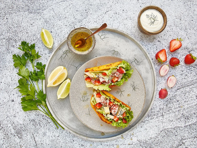 Retire os tacos de abóbora do forno e deixe arrefecer. Coloque em cada taco 1 folha de alface e 2 colheres de sopa do recheio e sirva com funcho picado.
