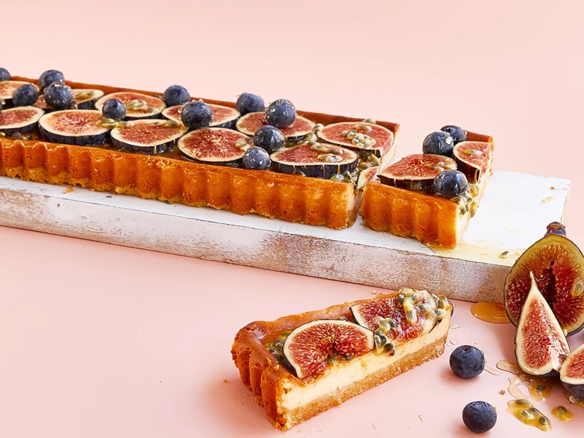 Cubra com a polpa de maracujá. Disponha os figos em fatias, os mirtilos e regue com um fio de mel.
