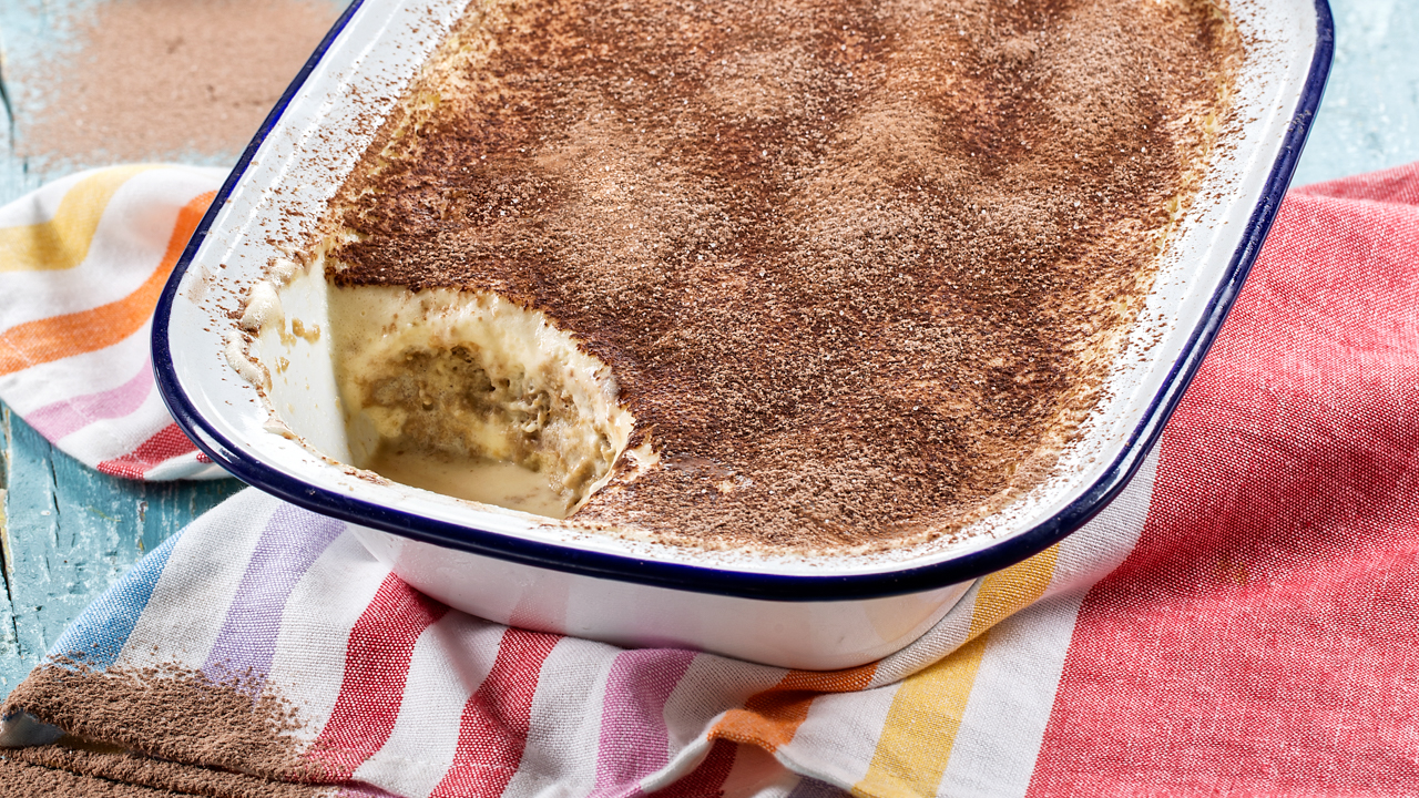 Numa taça retangular grande (ou duas médias), comece por colocar um pouco da mistura. Molhe rapidamente os palitos de champanhe no café, dispondo‑os por cima do preparado (não devem ficar excessivamente molhados). Repita a operação até formar várias camadas, terminando com o creme.