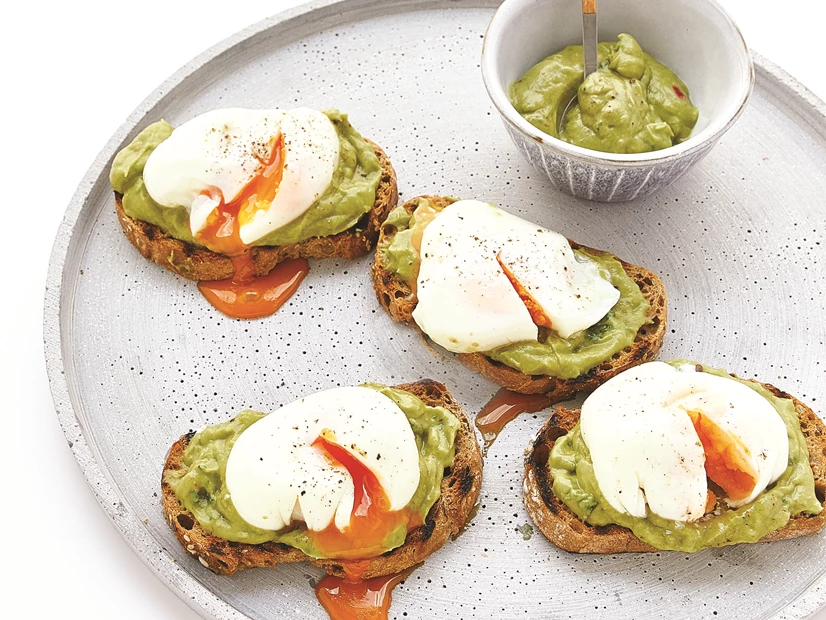 Torre as fatias de pão numa frigideira e barre com a pasta de abacate. Retire os ovos do invólucro e coloque por cima. Faça um pequeno corte no ovo para permitir que a gema escorra.