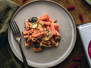 Massa Cremosa de Espinafres e Cogumelos com Parmesão Vegan de Caju