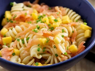 Salada de salmão fumado, fusilli e manga